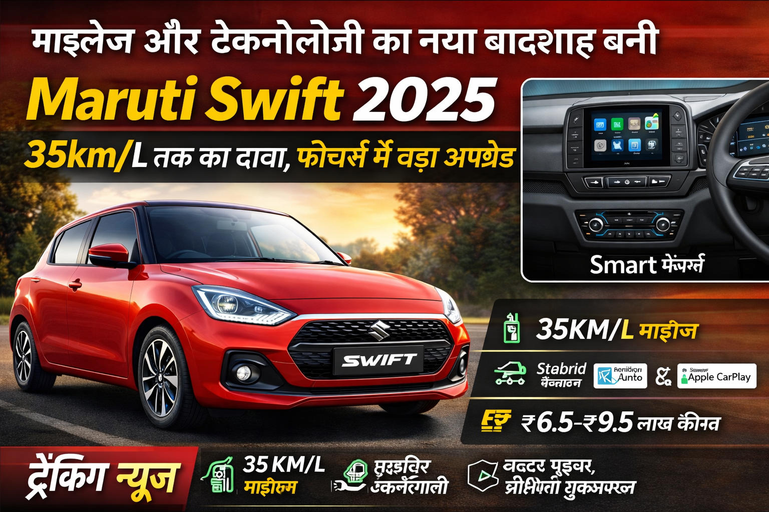 Auto Desk | December 30, 2025 भारतीय ऑटोमोबाइल बाजार में एक बार फिर 1 की Swift चर्चा के केंद्र में आ गई है। नई Maruti Swift 2025 को लेकर सोशल मीडिया और Google Discover पर जबरदस्त ट्रेंड देखने को मिल रहा है। बेहतर माइलेज, नई टेक्नोलॉजी और स्पोर्टी डिजाइन के कारण यह कार युवाओं के साथ-साथ फैमिली यूज़र्स को भी आकर्षित कर रही है। नया डिजाइन और प्रीमियम लुक Maruti Swift 2025 में पहले से ज्यादा शार्प और एयरोडायनामिक डिजाइन दिया गया है। नई ग्रिल, स्लिम LED हेडलैम्प्स, ड्यूल-टोन अलॉय व्हील्स और स्पोर्टी रियर प्रोफाइल इसे प्रीमियम हैचबैक सेगमेंट में मजबूत बनाते हैं। कार का ओवरऑल लुक पहले की तुलना में ज्यादा यूथ-फोकस्ड नजर आता है। Smart और Connected Features नई Swift में बड़ा टचस्क्रीन इंफोटेनमेंट सिस्टम, वायरलेस Android Auto और Apple CarPlay, डिजिटल इंस्ट्रूमेंट क्लस्टर, वॉयस कमांड और स्मार्ट कनेक्टिविटी फीचर्स दिए गए हैं। इसके अलावा ऑटो क्लाइमेट कंट्रोल और पुश-स्टार्ट बटन जैसी सुविधाएं भी शामिल की गई हैं। Engine, Hybrid Technology और Mileage Maruti Swift 2025 में नया पेट्रोल इंजन देखने को मिलता है, जिसे माइल्ड-हाइब्रिड टेक्नोलॉजी से जोड़ा गया है। कंपनी के अनुसार यह कार 30 से 35 km/l तक का माइलेज देने में सक्षम बताई जा रही है, जिसके कारण माइलेज प्रेमियों के बीच इसकी चर्चा तेजी से बढ़ रही है। इंजन को मैनुअल और ऑटोमैटिक गियरबॉक्स ऑप्शन के साथ पेश किया गया है, जिससे सिटी और हाईवे दोनों कंडीशन में स्मूद ड्राइविंग का अनुभव मिलता है। Safety Features में भी बड़ा सुधार सुरक्षा के लिहाज से Swift 2025 में डुअल एयरबैग्स, ABS with EBD, रियर पार्किंग सेंसर, हिल होल्ड असिस्ट और स्टेबिलिटी कंट्रोल जैसे फीचर्स दिए गए हैं। नई प्लेटफॉर्म स्ट्रक्चर के कारण कार की मजबूती भी पहले से बेहतर बताई जा रही है। संभावित कीमत और बाजार में हलचल भारतीय बाजार में Maruti Swift 2025 की शुरुआती कीमत लगभग ₹6.5 लाख से ₹9.5 लाख (एक्स-शोरूम) के बीच मानी जा रही है। कम मेंटेनेंस और शानदार माइलेज के कारण यह कार Google Discover पर ऑटोमोबाइल कैटेगरी में तेजी से वायरल हो रही है। Disclaimer: इस खबर में दी गई जानकारी मीडिया रिपोर्ट्स और ऑटो सेक्टर से जुड़े स्रोतों पर आधारित है। फीचर्स, माइलेज और कीमत में बदलाव संभव है। खरीद से पहले कंपनी की आधिकारिक वेबसाइट या नजदीकी डीलरशिप से पुष्टि जरूर करें।
