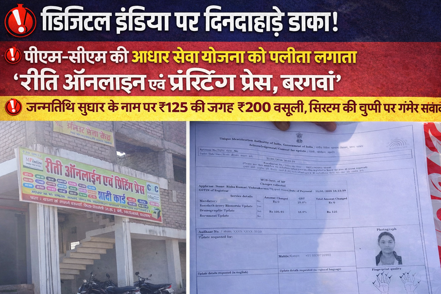 🚨 डिजिटल इंडिया पर दिनदहाड़े डाका! पीएम-सीएम की आधार सेवा योजना को पलीता लगाता “रीति ऑनलाइन एवं प्रिंटिंग प्रेस, बरगवां” जन्मतिथि सुधार के नाम पर अवैध वसूली, सिस्टम की चुप्पी पर गंभीर सवाल सिंगरौली / बरगवां। प्रधानमंत्री और मुख्यमंत्री ने जिस आधार सेवा व्यवस्था की शुरुआत आम जनता को राहत देने, पारदर्शिता लाने और भ्रष्टाचार खत्म करने के उद्देश्य से की थी, वही व्यवस्था आज जमीनी स्तर पर लूट और मनमानी का जरिया बनती दिखाई दे रही है। बरगवां स्थित “रीति ऑनलाइन एवं प्रिंटिंग प्रेस – आधार सेवा केंद्र” में सामने आया ताजा मामला सरकार की डिजिटल योजनाओं पर सीधा हमला माना जा रहा है। यह मामला सिर्फ एक महिला उपभोक्ता से जुड़ा नहीं है, बल्कि यह उस पूरे सिस्टम की पोल खोलता है, जो सरकारी अनुमति की आड़ में आम नागरिकों की मजबूरी को भुनाने में लगा हुआ है। प्राप्त जानकारी के अनुसार, एक महिला अपने आधार कार्ड में जन्मतिथि सुधार कराने के लिए रीति ऑनलाइन एवं प्रिंटिंग प्रेस, बरगवां पहुंची थी। UIDAI के पोर्टल के माध्यम से प्रक्रिया पूरी की गई और ₹125 की सरकारी रसीद भी दी गई। यहीं तक सब कुछ नियमों के मुताबिक था। लेकिन इसके बाद जो हुआ, वह सरकारी नियमों और नैतिकता — दोनों पर करारा तमाचा है। आरोप है कि आधार सेवा केंद्र के ऑपरेटर विनोद कुमार बैस ने रसीद देने के बावजूद महिला से ₹200 की अतिरिक्त राशि की मांग की। जब उपभोक्ता ने विरोध किया, तो “नियम”, “चार्ज” और “यही सिस्टम है” जैसे शब्दों का सहारा लेकर जबरन वसूली की गई। सबसे बड़ा सवाल यह है कि — जब UIDAI ने आधार अपडेट का शुल्क पहले से तय कर रखा है, तो यह अतिरिक्त पैसा किसके आदेश पर और किसकी जेब में जा रहा है? स्थानीय नागरिकों का कहना है कि यह कोई पहली घटना नहीं है। बरगवां क्षेत्र में रीति ऑनलाइन एवं प्रिंटिंग प्रेस को लेकर पहले भी फुसफुसाहट होती रही है कि आधार से जुड़े कामों में तय शुल्क से ज्यादा वसूला जाता है। लेकिन आधार जैसी अनिवार्य पहचान के कारण लोग मजबूरी में चुप रह जाते हैं। प्रधानमंत्री ने आधार सेवा को “डिजिटल इंडिया” की रीढ़ बताया था और मुख्यमंत्री ने इसे अंतिम व्यक्ति तक सुविधा पहुंचाने का माध्यम। मगर अगर अधिकृत आधार सेवा केंद्र ही सरकारी नियमों को ठेंगा दिखाने लगें, तो यह न सिर्फ आम जनता के साथ धोखा है, बल्कि सीधे-सीधे सरकार की साख पर सवाल है। यह मामला प्रशासनिक निगरानी पर भी बड़ा प्रश्नचिह्न लगाता है। क्या जिला प्रशासन को इस केंद्र की गतिविधियों की जानकारी नहीं? क्या आधार सेवा केंद्रों की नियमित जांच सिर्फ कागजों तक सीमित है? या फिर सब कुछ जानते हुए भी आंखें मूंद ली गई हैं? नियम बिल्कुल साफ हैं— आधार अपडेट के लिए UIDAI द्वारा तय शुल्क के अलावा एक रुपया भी लेना गैरका