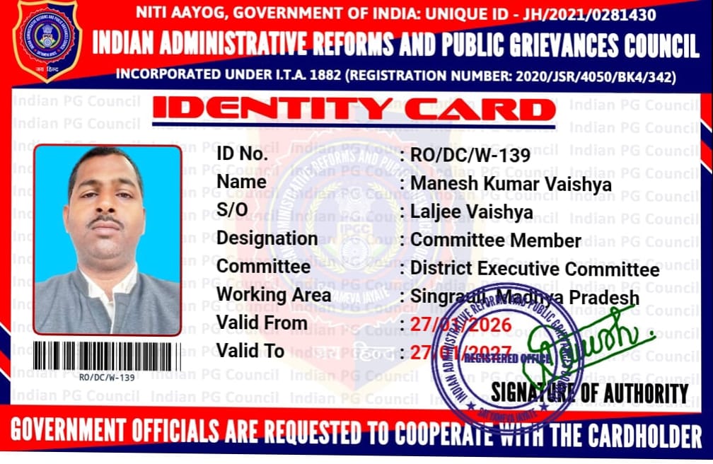 सिंगरौली (मध्य प्रदेश)। भारतीय प्रशासनिक सुधार एवं लोक शिकायत परिषद द्वारा मनेश कुमार वैश्य को जिला कार्यकारी समिति सदस्य, जिला सिंगरौली (मध्य प्रदेश) नियुक्त किए जाने पर जिले में हर्ष का माहौल है। मनेश कुमार वैश्य को यह दायित्व उनकी सामाजिक सक्रियता, जनसेवा के प्रति समर्पण एवं संगठनात्मक क्षमता को देखते हुए सौंपा गया है। परिषद के माध्यम से वे अब आम जनता की समस्याओं को प्रशासन तक पहुँचाने, जनहित से जुड़े मामलों में सहयोग करने तथा लोक शिकायतों के समाधान की दिशा में महत्वपूर्ण भूमिका निभाएंगे। नियुक्ति के उपरांत जिले के सामाजिक संगठनों, शुभचिंतकों एवं आम नागरिकों ने उन्हें हार्दिक बधाई एवं शुभकामनाएं दीं और आशा व्यक्त की कि उनके नेतृत्व में जनहित से जुड़े कार्यों को और गति मिलेगी। परिषद के पदाधिकारियों ने विश्वास जताया कि मनेश कुमार वैश्य अपने दायित्वों का निर्वहन पूरी निष्ठा, ईमानदारी एवं पारदर्शिता के साथ करेंगे और संगठन की गरिमा को और मजबूत बनाएंगे। ॥ हिम्मत आपकी – सहयोग हमारा ॥